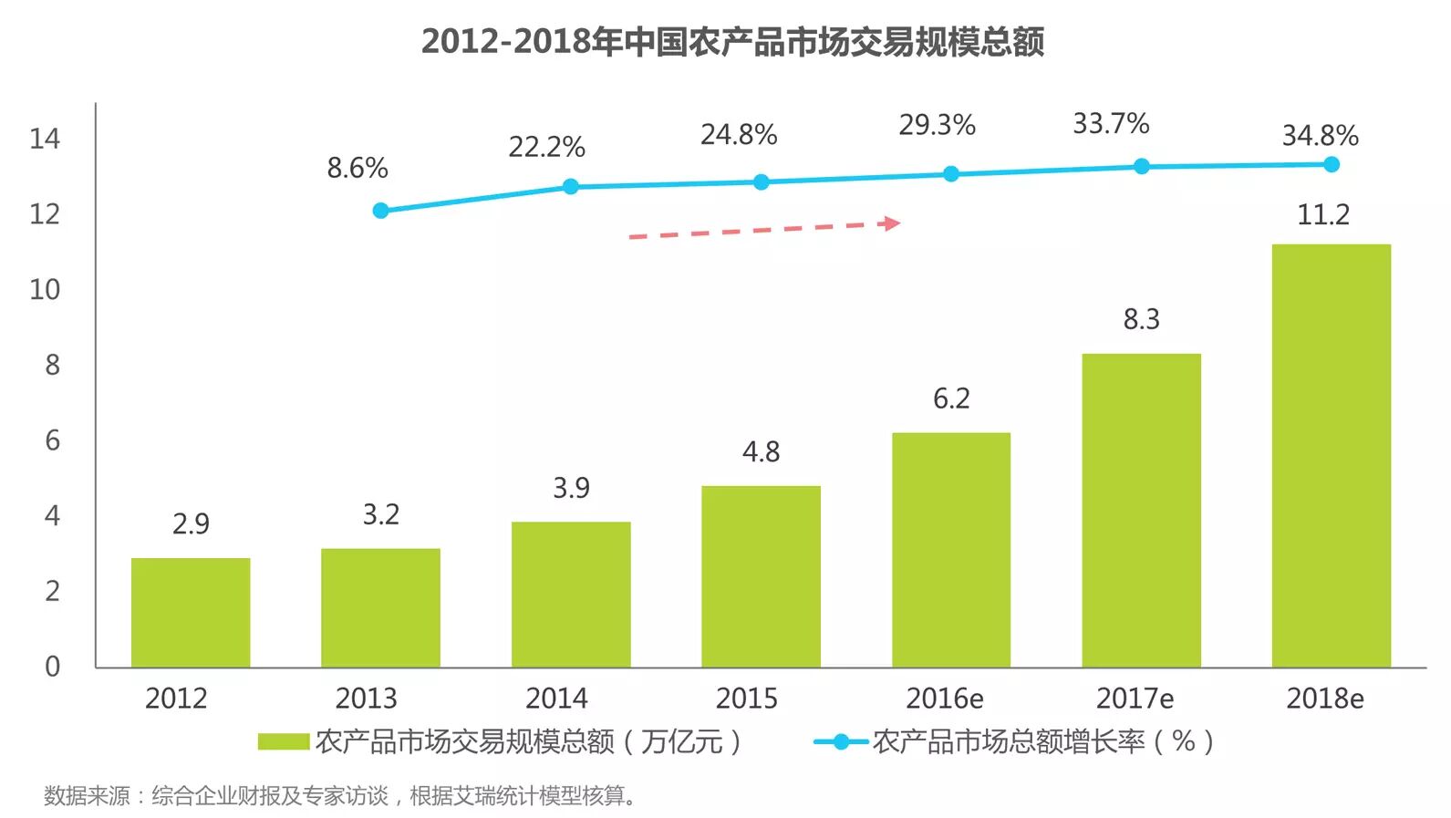 在国家惠农政策的扶持下,我国农产品交易规模逐年增长。2015年农产品市场交易总额达4.8万亿元,同比增长24.8%,艾瑞预计未来仍将保持稳步增长。