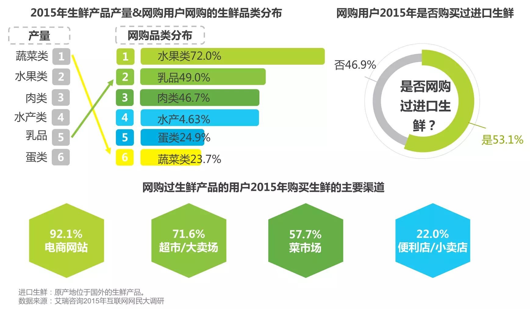 2015年最畅销的生鲜网购品类Top3分别为:水果、乳品、肉类。作为生鲜产品大类的蔬菜在网购中占比偏低,产量较少的乳制品由于市场需求而大量进口,成为网购热销品类之一。网购过生鲜产品的用户对这种购物方式的认可度较高。进口生鲜购买率较高。