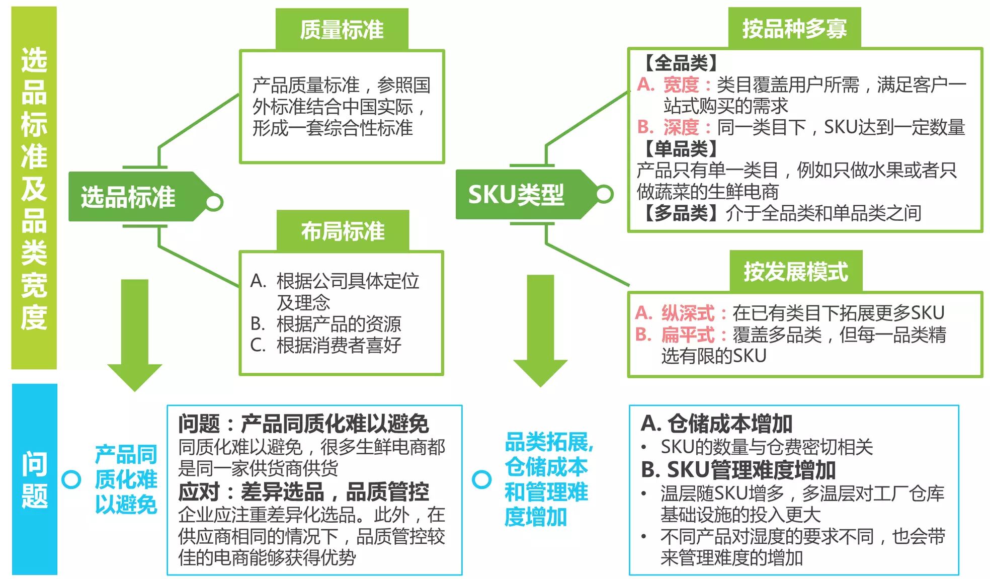 生鲜电商根据一定的质量标准,从地域资源和SKU两个方面考量进行选品和品类拓展,但面临拓展成本增加和同质化问题。