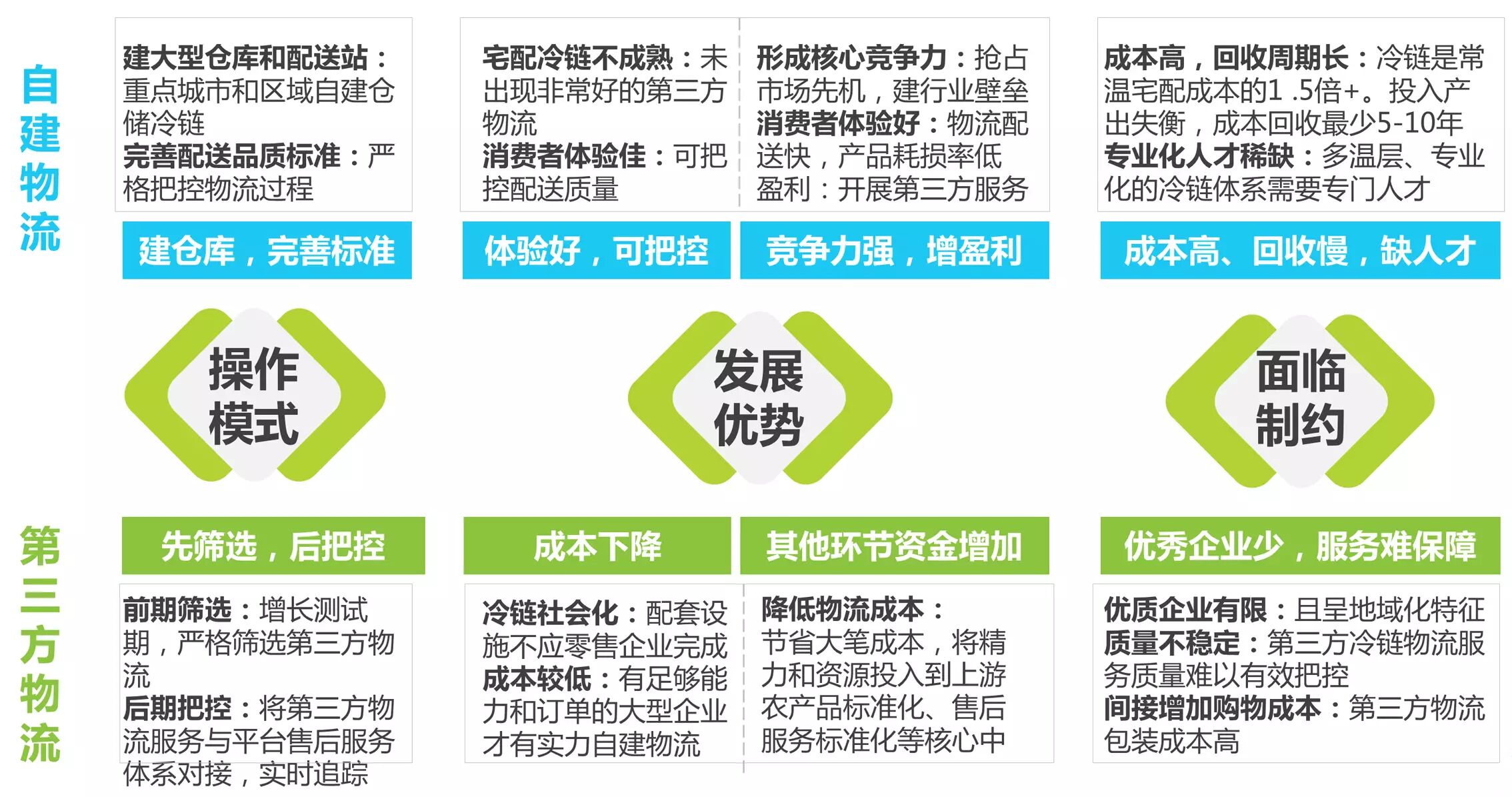 自建物流有自身配套的仓库和自成体系的标准,体验好、易把控,并能够成为生鲜电商的竞争力,并在未来带来盈利。不过,由于建立成本过高,中小规模企业往往没有能力自建物流,在使用第三方物流的时候,应做好前期的筛选和后期的把控,以保障服务质量。