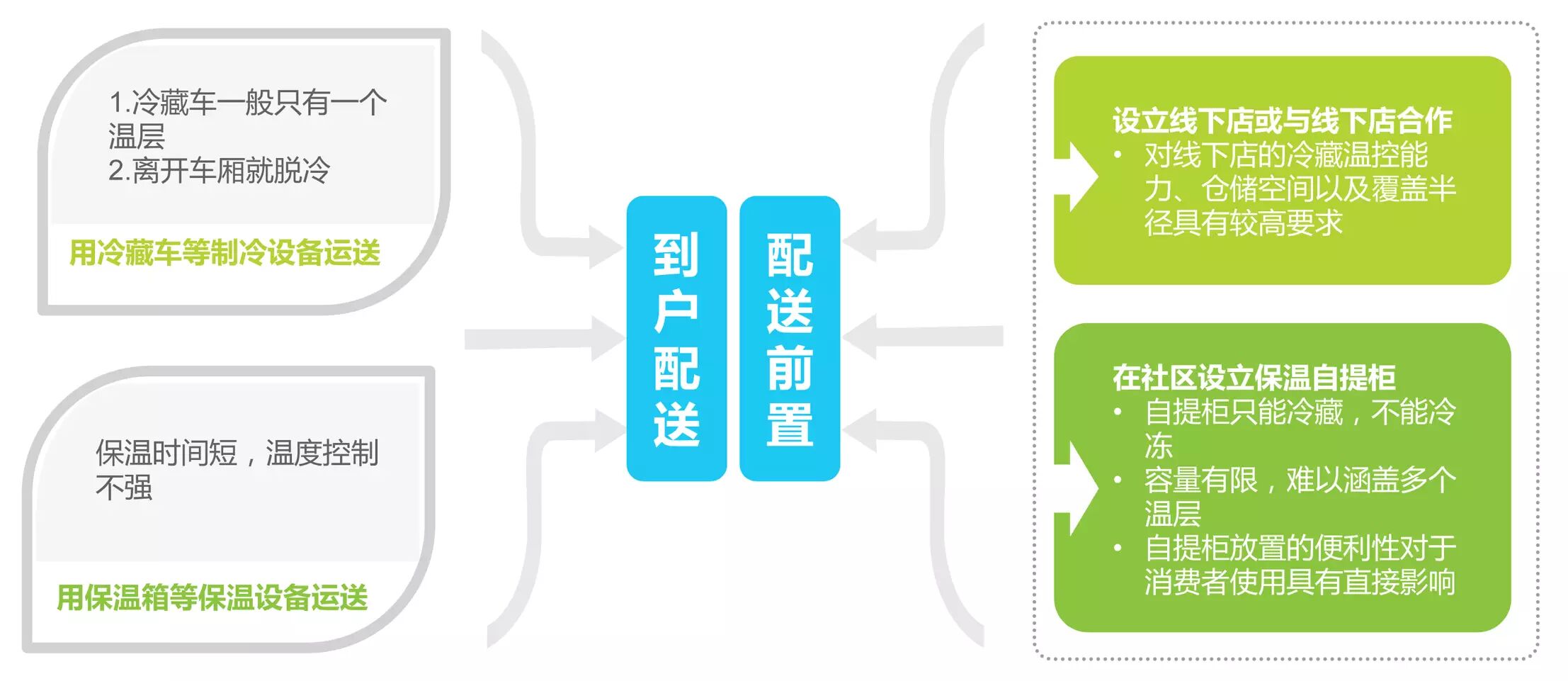 分布式仓储模式其实是中间形态,长期来看与线下店的合作能够趋向及时送。从成本、时效和服务质量控制等角度考虑,在拥有足够的订单量以及商家对于自身供应链布局的谋划具有掌控与管理能力的前提下,“商家商品的分布式仓储(离买家最近)+同城或本地配送(减少递送环节)”是冷链物流模式的趋势。