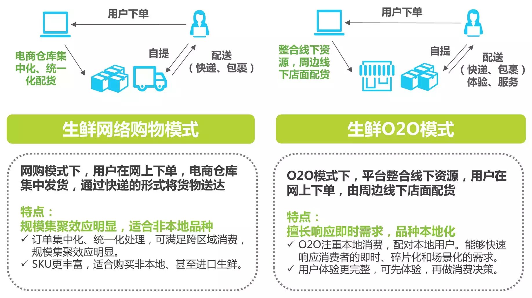 生鲜电商网络购物模式是指用户在线上下单,商家仓库发货,通过自建或第三方物流将货物送达;O2O的商业模式中,前端是客户在线下单,服务商收到订单后整合供应链,通过多种终端(快递包裹、自提柜、便利店或商超)将商品交接到客户手中。