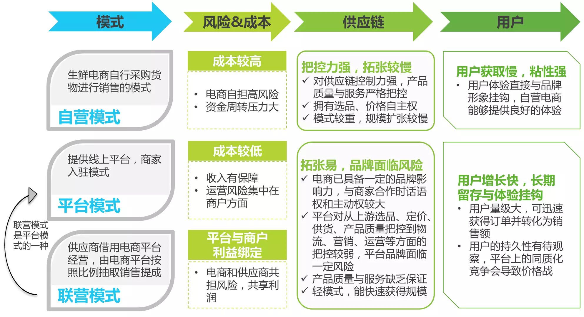 根据生鲜电商是否介入运营,其商业模式可以分为平台模式、联营模式和自营模式。其中,联营模式也属于平台模式的一种。