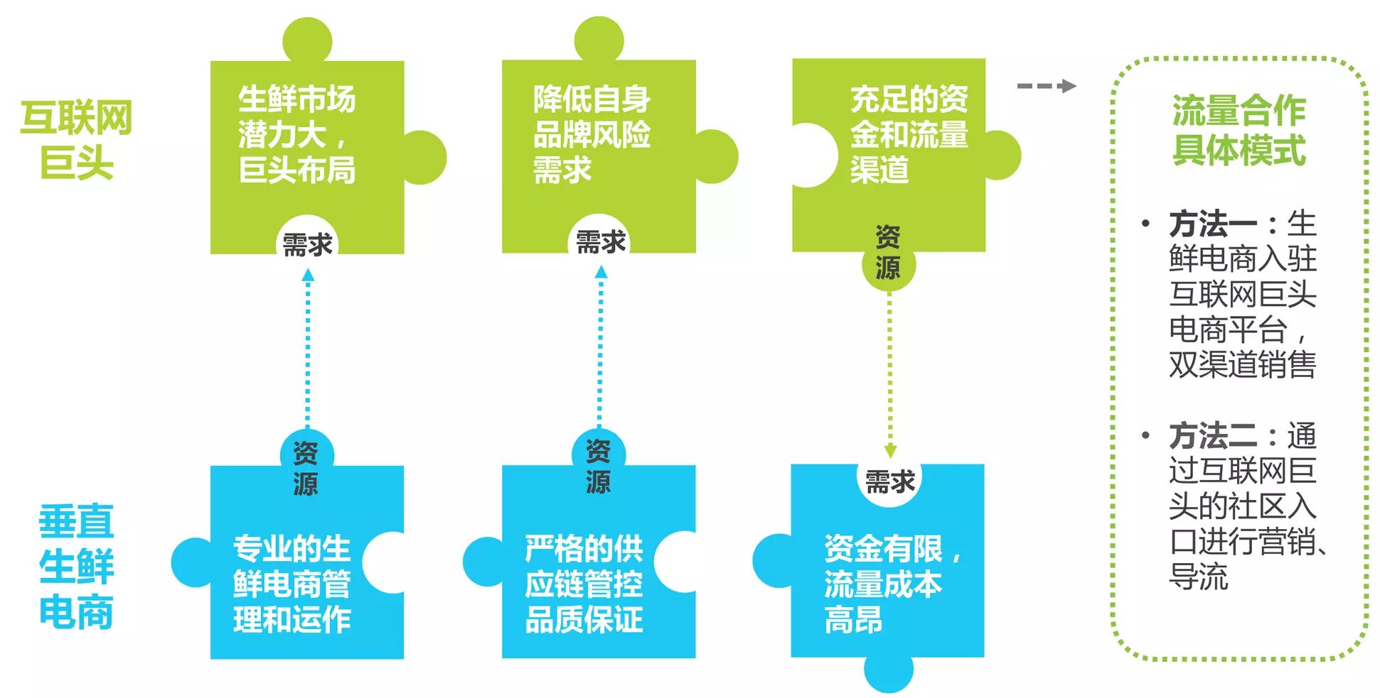 互联网巨头拥有巨大的资金和流量优势,具有布局生鲜市场的需求,但缺少专业人才和供应链管控;垂直生鲜电商具有高专业性和供应链优势,但缺少资金和流量支持。垂直生鲜电商与互联网巨头合作是优势互补,共赢的选择。