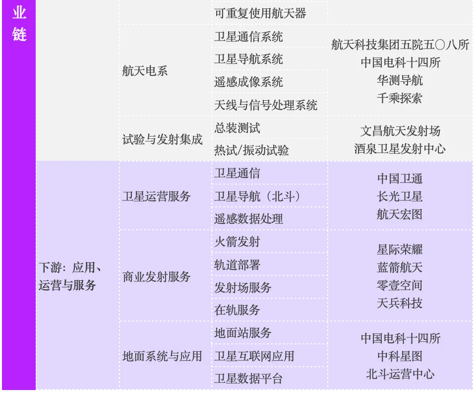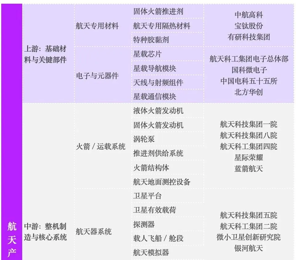 航天产业链是一个典型的“多环节、高技术壁垒、紧密协同”的复杂体系,从基础材料和核心技术研发到零部件制造、航天装备组装,再到发射服务与应用运营,形成了一个高度集成的技术与产业生态。