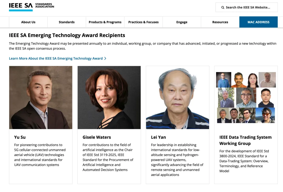 IEEE(电气电子工程师学会)是全球最大的专业学术组织,也是国际核心技术标准制定机构之一。其新兴技术奖旨在表彰通过IEEE 开放共识流程开创、推进或发展新技术的个人、工作组或企业,是IEEE前沿科技领域的权威荣誉之一,每年表彰在全球标准工作中做出杰出贡献的2-3名个人或集体,获奖者由IEEE内部专家严格评选,含金量极高,在国际科技界具有高度权威性和广泛影响力。