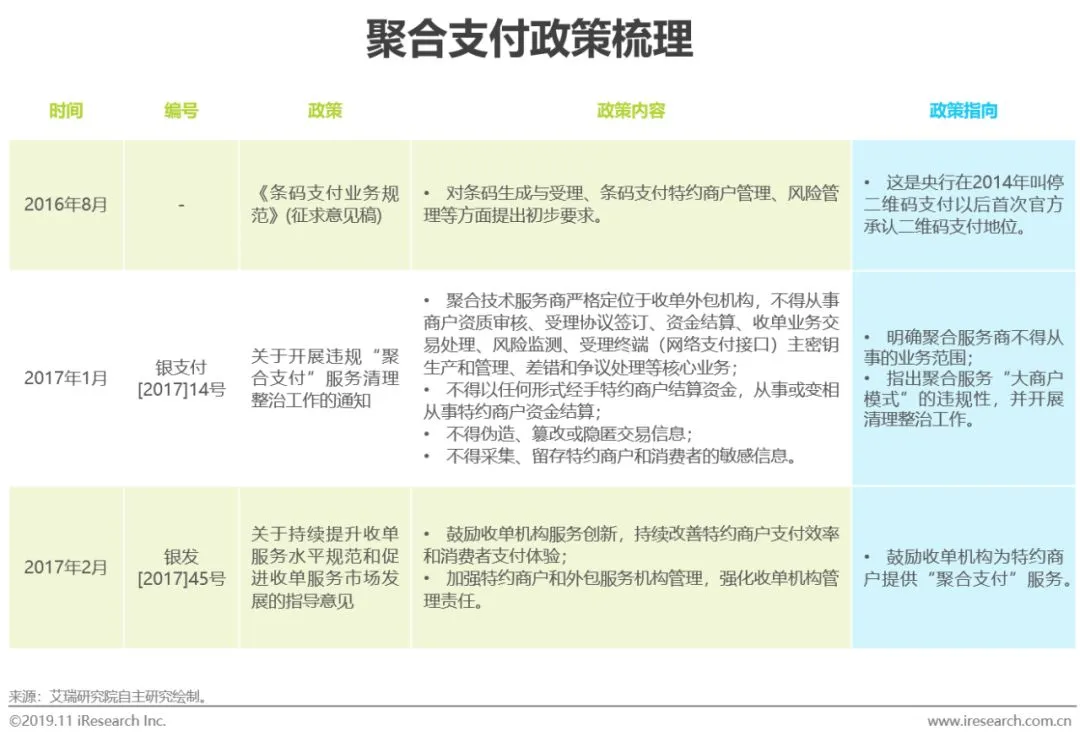2014年起,随着线下扫码支付的发展,以及支付产品日趋多样化且零散化,提供支付方式一体化整合服务的聚合支付迎来发展机遇。进入2016年以来,聚合支付产品快速迭新且被大范围推广,在上游支付机构激烈竞争的推动下,聚合支付规模爆发;从2017年下半年开始,聚合支付监管政策陆续出台,严查“二清”,行业发展走向健康合规。