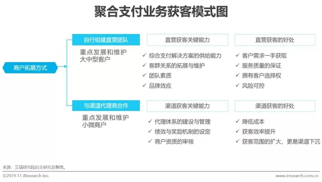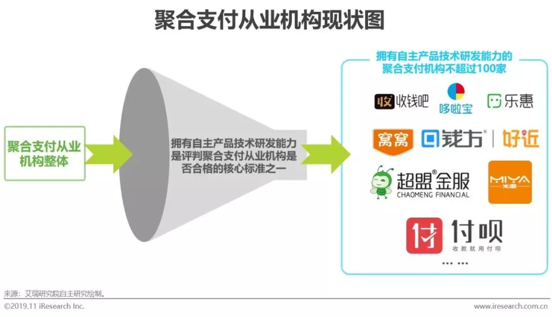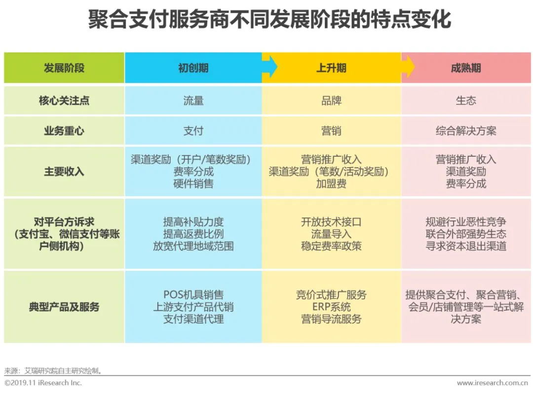 行业价值:对于商户,聚合支付一站式接入各种电子钱包,为商户带来了更便捷的收银体验,同时基于交易数据的沉淀为商户带来更精准的营销、更数字化的运营管理以及更低门槛的贷款等增值服务;对于各电子钱包,聚合支付拉平了各电子钱包的受理范围,助力行业实现互联互通;对于收单机构,聚合收单外包商承担了收单机构线下商户拓展的部分责任,让收单服务更专业化、垂直化并且不断优化。