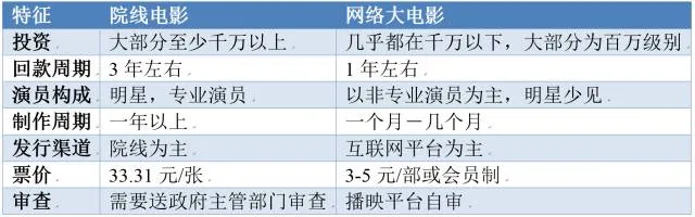 2013年底,爱奇艺出于探索新的付费盈利模式的目的,率先将一些长度较长、质量较好的微电影移至付费频道,取得了不错的效果。而为了进一步提高这类内容对观众的付费吸引力,业界开始探索如何对微电影进行升级。2014年,爱奇艺率先定义了“网络大电影”,“网络”二字与院线电影形成区隔,指主要通过互联网发行,而“大”则与“微”电影划清界限,相对于微电影,网络大电影的投入更大、篇幅更长,盈利模式也有明显差异。微电影主要依靠植入广告或贴片广告盈利,免费播出。网络大电影的收入则主要来自付费点播。