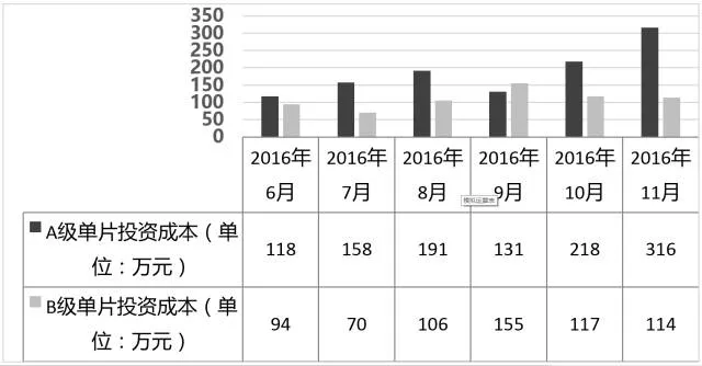 2014年,试水阶段的网络大电影投资较低,大部分单片投资都在30万以下。到2015年,网络大电影的投资有所增长,但大多仍在50万元以下。到了2016年,随着市场的爆发式增长,网络大电影的投资也一路攀升。100万到300万之间的作品层出不穷,甚至出现了多部千万级投资作品。例如由王晶监制,郑伊健、周秀娜主演的爱奇艺自制网络大电影《我的极品女神》。2016年8月,中南影业和奇树有鱼共同发布29部网络大电影片单,邀请高群书等导演加盟,其中每部片子的计划投资都在500万以上。据爱奇艺公布的数据,自其2016年年中提出“网大精品化”战略以来,在爱奇艺播出的网络大电影单片成本不断走高,如下图9-3-1所示,从2016年8月到11月,爱奇艺B档独家影片平均成本已连续多月突破100万,而A档影片平均成本也呈现波动式上行的趋势,2016年11月时已经突破300万。平均投资水平走高,反映出网络大电影的制作水准和工业化程度正在快速提高。