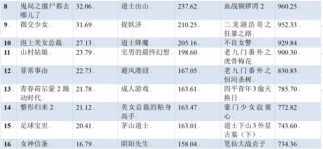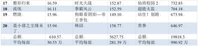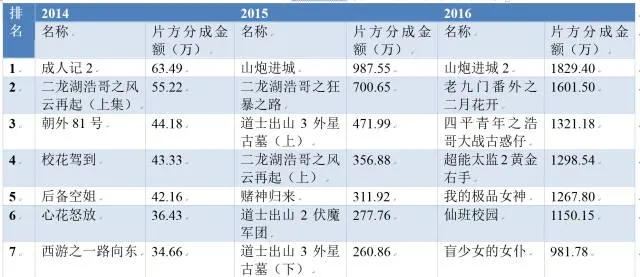 表9-3-3 2014-2016年爱奇艺片方分账前20位影片排行榜