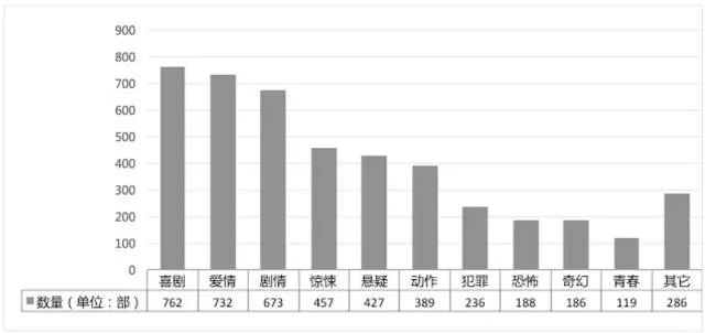 本图根据各大视频网站对上线的网络大电影给予的类型标签进行统计,由于一部影片可能有好几个类型标签,存在重复统计的现象