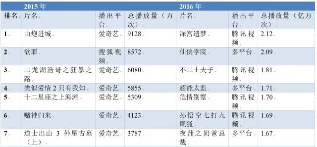 表9-3-7 2015年-2016年网络大电影全网播放量排名前10影片