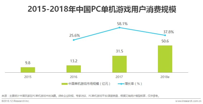 根据艾瑞对中国PC单机游戏用户消费规模核算,中国PC单机游戏用户消费规模保持较为快速的增长,2017年消费增速最快,规模达到31.5亿元,预计2018年中国PC单机游戏用户消费规模可达到50.6亿元。