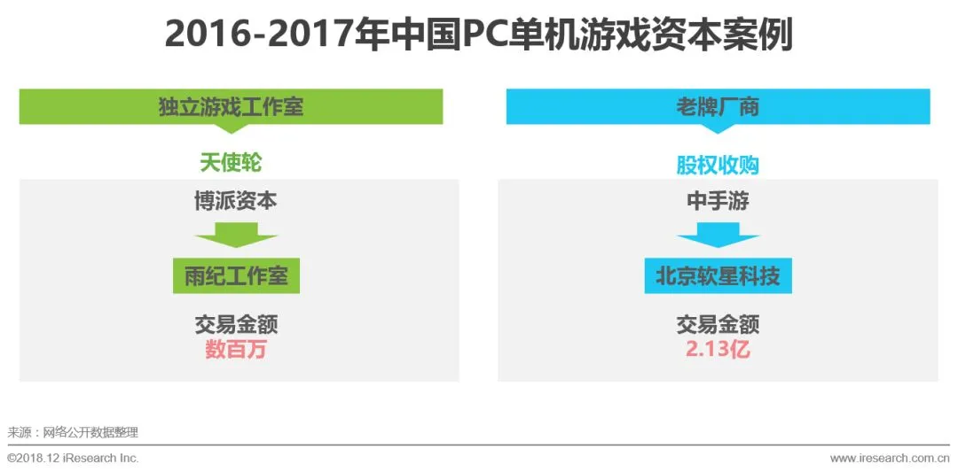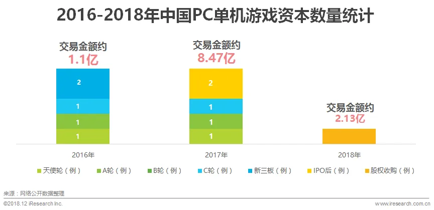 艾瑞咨询认为,PC单机游戏产业链各环节活跃度较低,成本高变现难以及竞争优势不明显等原因,令资本对其热情不高。2018年随着游戏版号审批暂停,以及整个资本市场资金收紧等方面的影响,资本对PC单机游戏市场的投资更为谨慎。