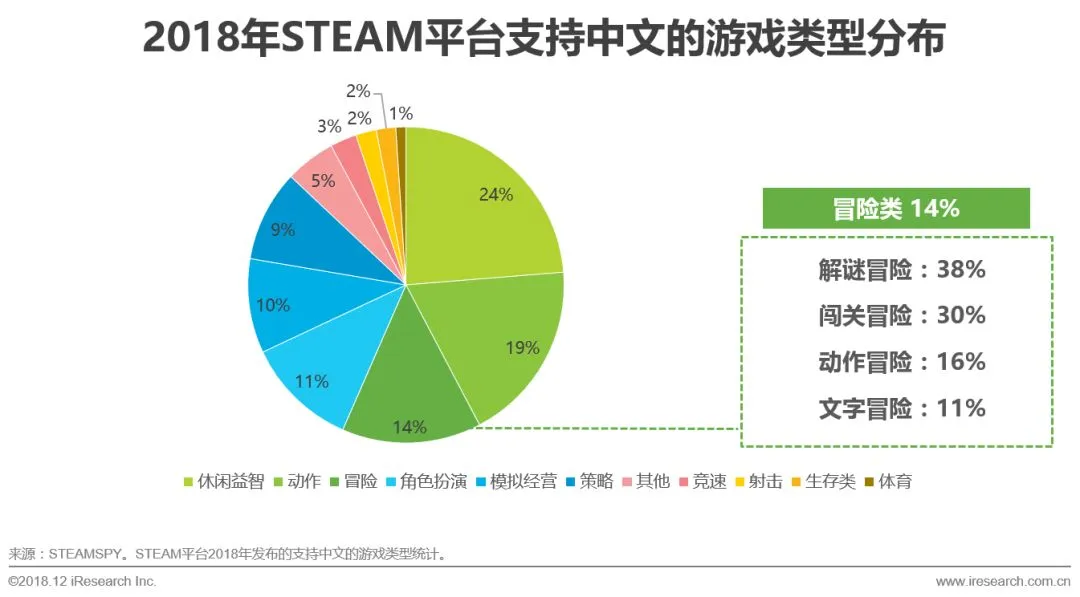 根据对STEAM平台2018年上架的支持中文的游戏统计来看,主要游戏类型分别是休闲益智、动作类和冒险类。冒险类游戏衍生出较多的细分品类,其中解谜类的冒险游戏占比较多。