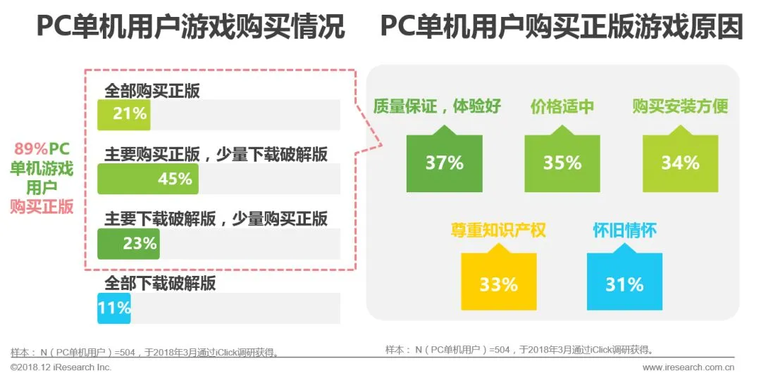 中国PC单机游戏用户中,有89%的用户购买过正版游戏,其中21%的用户只购买正版PC单机游戏。游戏质量和体验、价格适中、购买安装方便是用户选择购买正版的主要原因。
