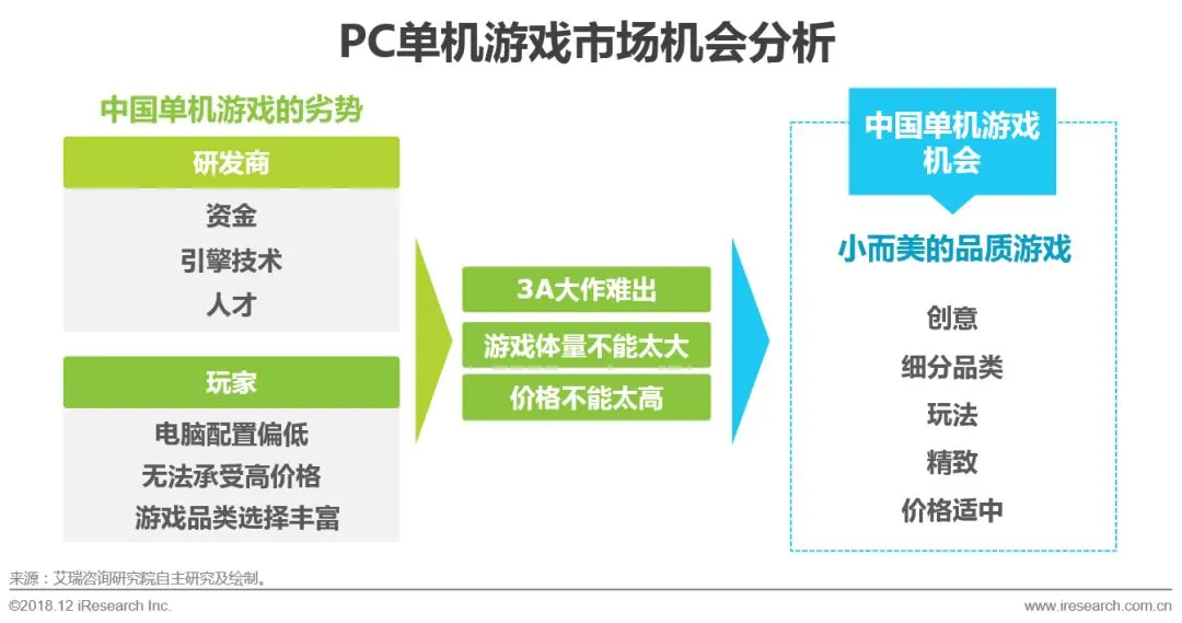 精致和创意是中国单机游戏的机会。中国单机游戏研发商普遍规模较小,资金不足,大型游戏引擎的技术与人才储备有限,国内具备3A级游戏大作经验与能力的PC单机研发商太少。同时,国内玩家普遍电脑配置低、玩家可承受购买价格不高以及网游选择丰富等都给高投入的单机游戏带来极大的成本回收压力。