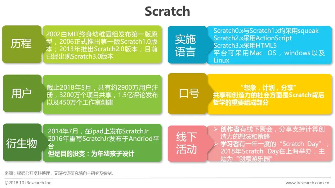 Scratch是由麻省理工媒体实验室终生幼稚园组在2006年发布的一套计算机程序开发平台,旨在让编程初学者在不需要学习编程语法的基础上设计产品。开发者期待通过该平台启发用户在愉快的环境下学习程序设计和数学,同时获得创造性的思考以便利用与STEAM学习当中。目前国内企业已经研发出其他可用于少儿编程的语言,同时已有完善的分享流程,这也是尚未公开发布的Scratch3.0中做出的改进之一。