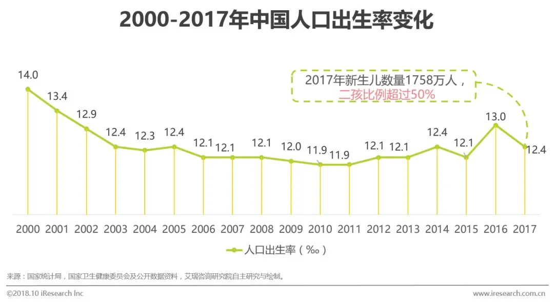 2016年元旦正式实施的“全面二孩”政策促使2016年人口出生率为12.95‰,是自2002年以来的最高值。根据卫计委的公布数据显示,2017年新生儿数量较2016年略有下降,但二孩比例却在上升。
