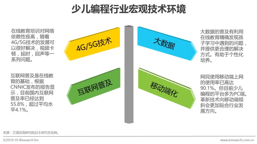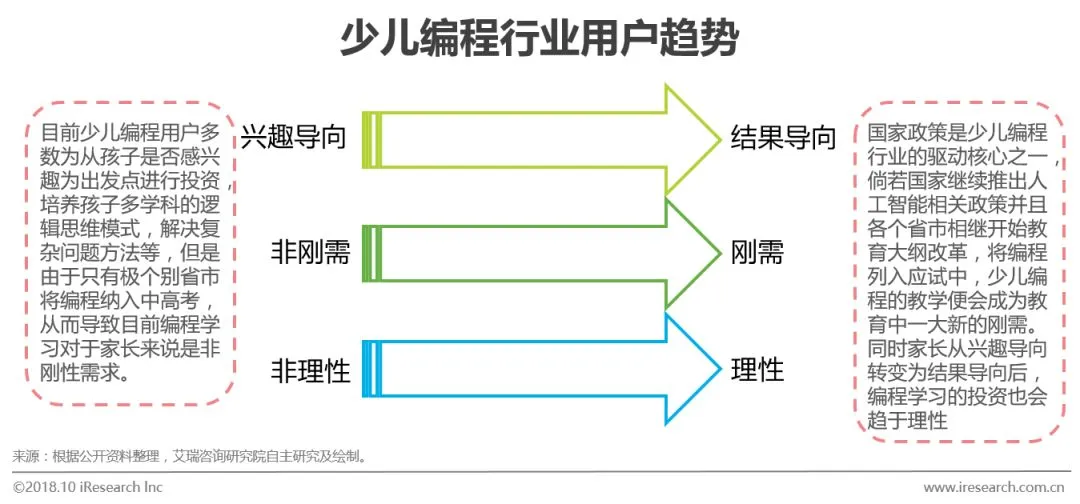 艾瑞咨询认为,近年来国家各部委相继高频率推出人工智能+教育相关政策,是少儿编程行业发展的一大助推器,同时投资机构的竞相追逐也为行业带来燃料。K12教育行业的本质就是教育本身,随着资本的不断涌入,行业内企业仍需沿着正确的方向发展。