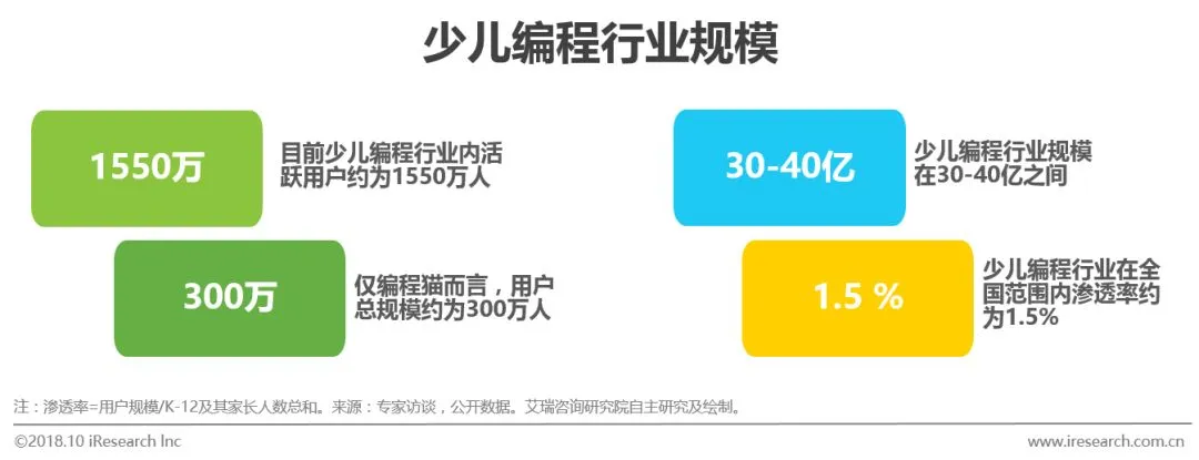 市场规模:目前少儿编程行业的市场规模在30-40亿之间。尚不足以对标青少儿英语培训行业的600亿规模。在全国范围内,少儿编程行业的渗透率也仅为1.5%左右。