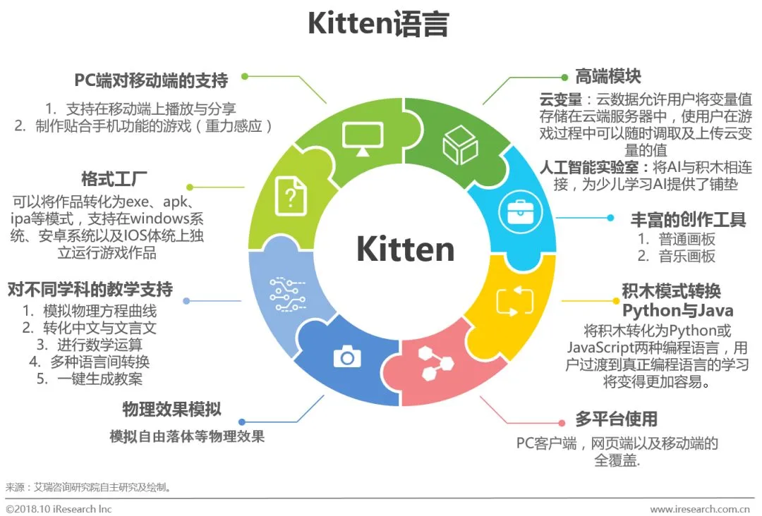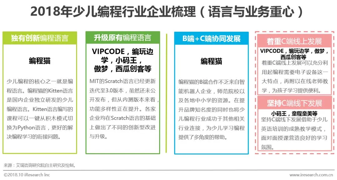 艾瑞咨询认为,少儿编程行业内企业所选择的授课模式,教学内容(图形化编程)均大同小异,但在编程工具开发,企业战略方向上却有这很明显的区别。全新编程语言Kitten的研发及应用,移动端NEMO的推出以及在B端对接全国4300所中小学,AI硬件厂商,动漫厂商,与高校联合培养少儿编程教师方面来看,编程猫在目前国内少儿编程行业内有着独具特色的发展理念及关乎行业未来的思考方式。