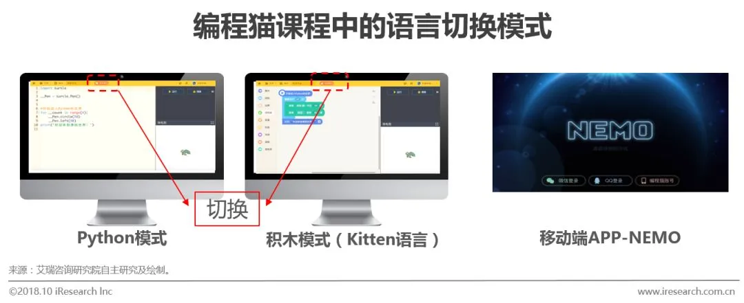 平台:2018年6月15日Nemo已经在IOS平台开放下载。这是国内企业自主研发的首款移动端少儿编程APP。移动端Nemo的研发成功,使得编程猫更好的兑现了“孩子随时随地编程”的愿望。同时随着手机的普及以及手机拥有者的年轻化,编程学习从PC端转移至移动端只是时间问题。