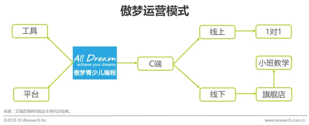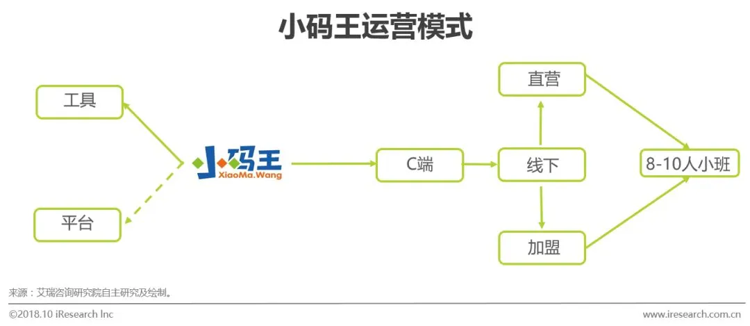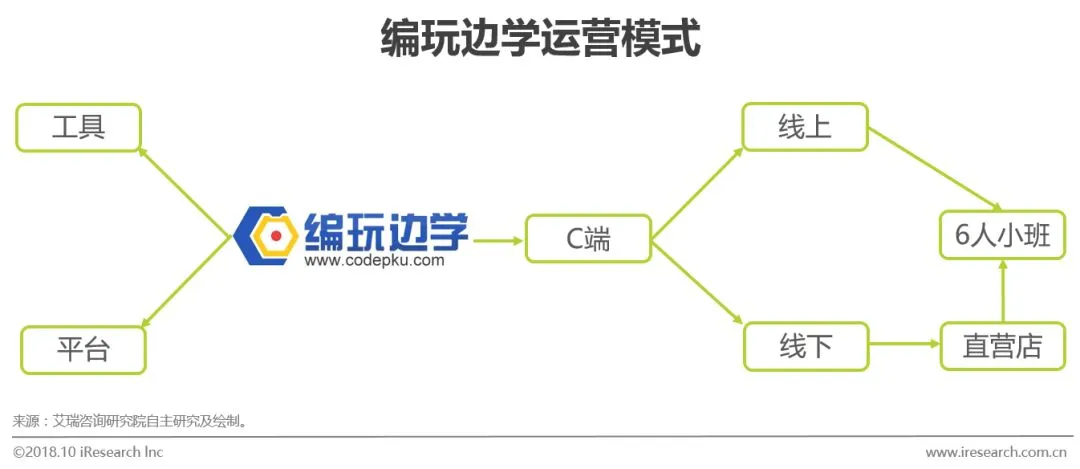 总结:小码王是一家专注线下面授的少儿编程企业,目前在全国8省11市开设19家线下店。小码王与B端学校有合作,但合作模式与编程猫的纯B端稍有区别。小码王主要在偏C端层面上以校内宣传及在学校内开设社团课的方式与中小学校合作为线下店引流,这是最主要的一个获客渠道,其他渠道还包括传统的地推等形式。该模式可以使得品牌在其所覆盖的区域内达到一个较高的渗透率,其后通过教育培训领域中最有效的口碑传播达到提升品牌影响力,吸引客流的目的。同时开发线上平台也是对线上用户高转化率的理解从而做出的战略调整。