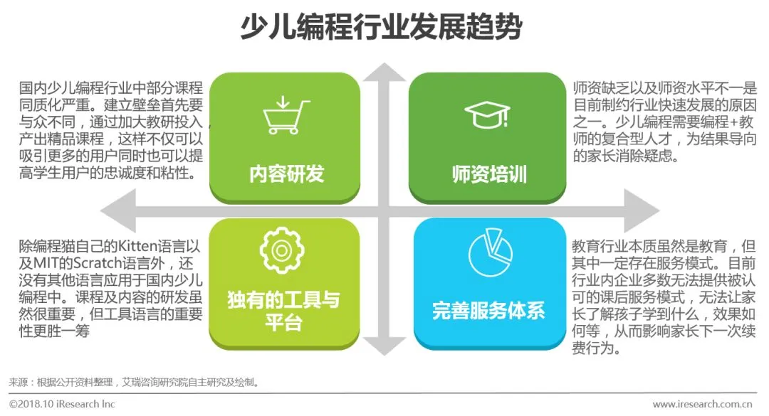 少儿编程行业未来发展方向主要集中在如何解决行业内共性问题:师资力量不足,部分课程内容同质化严重,平台不完善以及服务体系缺失上。