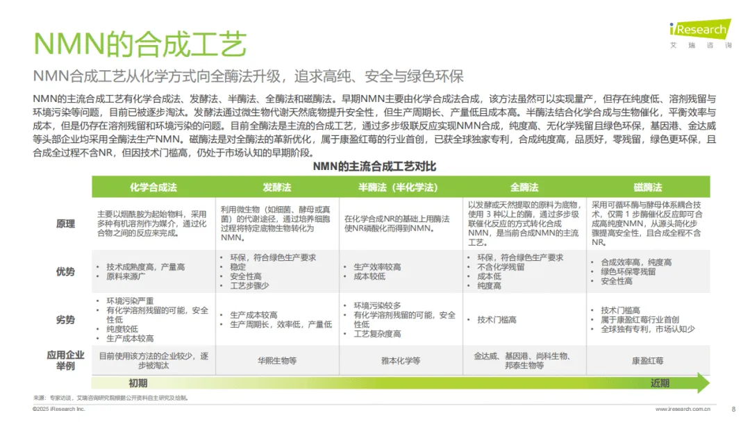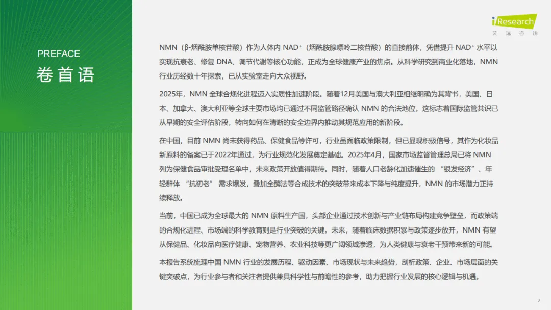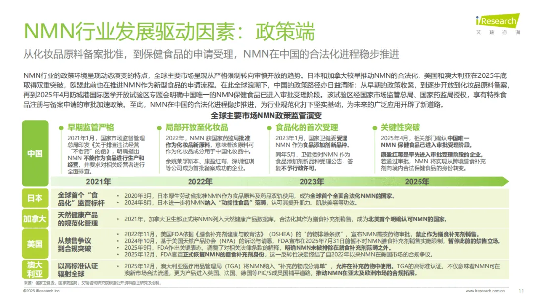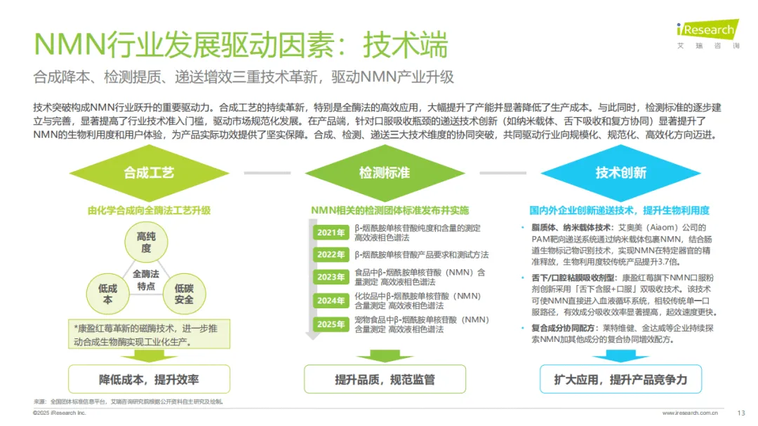 行业发展受多重因素驱动。政策端,全球主要市场合规化进程加速,美国、日本、澳大利亚等已明确NMN合法地位,中国也呈现积极信号,NMN作为化妆品新原料已完成备案,2025年4月被列入保健食品审批受理名单。需求端,人口老龄化催生的“银发经济”与年轻群体“抗初老”需求形成双重动力,为行业提供广阔市场空间。技术端,合成降本、检测提质、递送增效三重革新,推动行业向规模化、规范化、高效化升级。