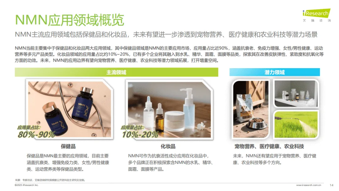 中国NMN市场自2020年大规模进入后稳步增长,预计2025年市场规模将突破30亿元。应用领域集中于保健品和化妆品,其中保健品占比近90%,涵盖抗衰、增强免疫力等多元类型;化妆品领域则探索其在抗皱紧致、抗氧化等方面的功效。销售渠道以跨境电商为主,占比60%-70%,品牌私域渠道占比约30%。
