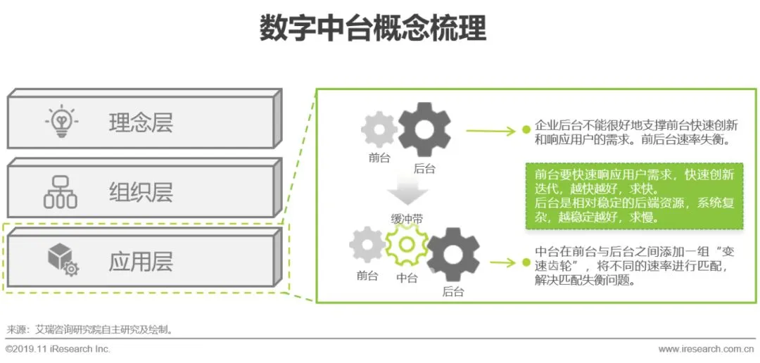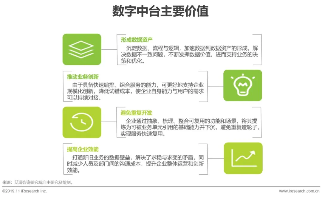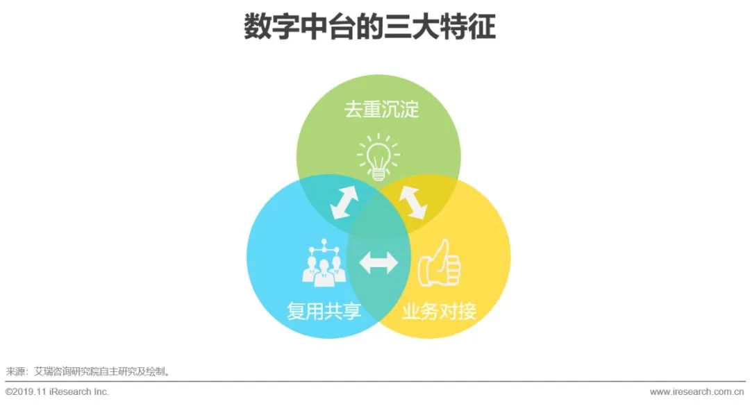 数字化进程从消费互联网正逐渐向产业互联网的方向演进,主体由消费端用户向供给端企业转变。为顺应趋势和挑战,很多企业开始实施中台战略。本报告认为,中台由三层含义构成:一是快速响应需求变化的管理模式或理念;二是人员、组织结构、部门职能的调整提高效能;三是在数字化层面上技术和业务等能力进行跨业务单元的整合沉淀。本报告主要围绕第三层展开,第一层与第二层在报告部分章节也有所体现。当前,数字中台概念尚未统一。艾瑞认为:数字中台是将企业的共性需求进行抽象,并打造为平台化、组件化的系统能力,以接口、组件等形式共享给各业务单元使用。使企业可以针对特定问题,快速灵活地调用资源构建解决方案,为业务的创新和迭代赋能。简言之,数字中台是企业数字能力共享平台,是平台的平台。作为企业 IT资源的综合指挥和调度平台,它以统一的标准和流程规范,帮助企业实现业务互联互通、资源协调和信息共享。