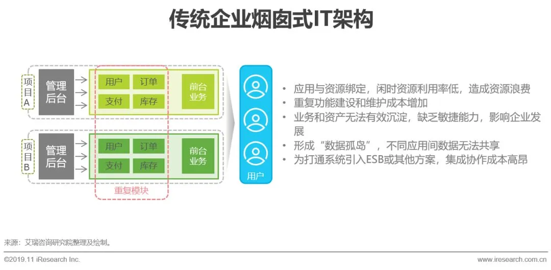 1981年财政部推动提出“会计电算化”概念,企业信息化的序幕就此开启。20世纪90年代中后期,企业信息化进入了快速发展时期,IT建设以数据库、ERP 为主。2013年后移动互联网发展,通过移动设备和各类传感器,更多行业积累了远超以往量级的数据。企业的业务形态、数据维度变得复杂多元,新的业务需求不断涌现。企业对数据治理、数据价值、数据驱动等概念有了认识。但传统烟囱式IT架构下数据形成孤岛,不易形成闭环,无法实现企业效率的提升,成了企业在数字化过程中最大痛点,在企业对数据驱动力日益迫切的需求下,数字中台是数字化转型过程自然演进的结果。