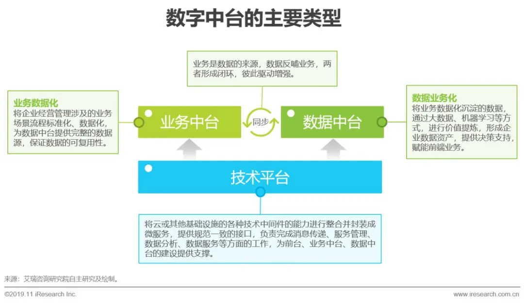 “业务中台+数据中台”双中台是主要类型,两者相辅相成虽然中台的概念宽泛,但艾瑞认为,针对企业而言,数字中台是以业务中台、数据中台两种为主要类型,而用户中台、内容中台是数据中台的特殊形式。业务中台是基础,进行业务数字化,产生的数据不断反馈到数据中台,进行数据资产化,驱动业务创新发展,两者相辅相成,相互演进融合,形成增强闭环。艾瑞认为,技术中台是为了更好地支撑业务中台和数据中台快速建设,因此目前技术中台更偏“稳定”,所以从宏观视角来看,技术中台可归为技术平台。