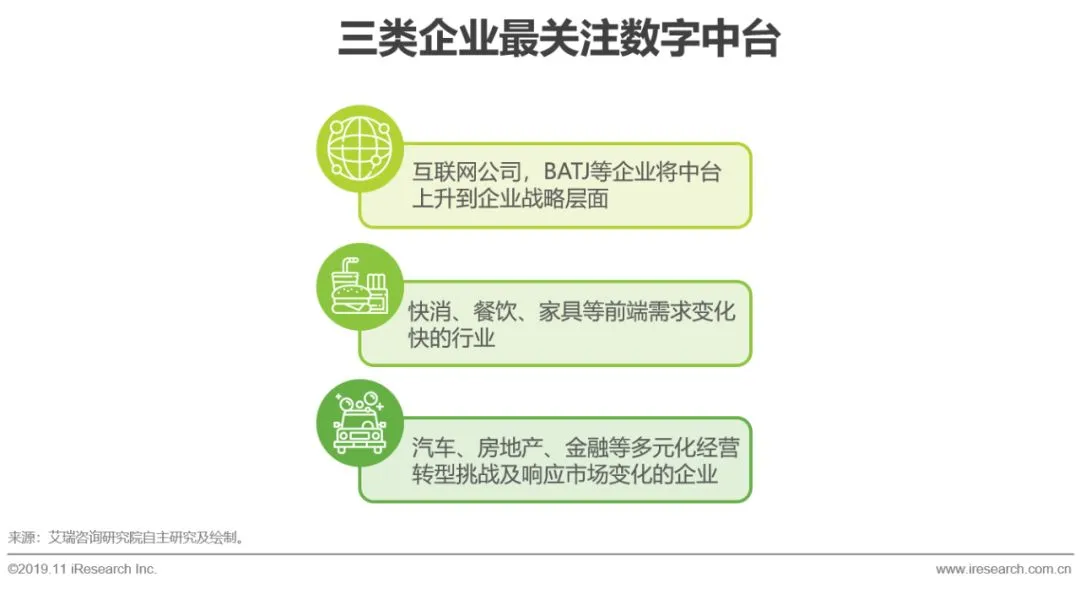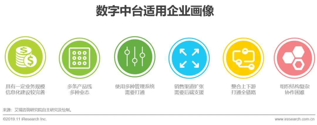 艾瑞认为满足以下任意两种条件的公司需要数字中台:①公司营收具有一定规模,信息化建设达到一定水平,有数据积累;②内部有多条产品线或多种业态,各个业务单元之间存有重复的功能模块;③企业内部使用了多种管理系统,需要打通系统壁垒进行统一管理;④对外需要多业态扩张,多消费渠道触达;⑤希望协调整个上下游合作伙伴之间资源;⑥内部组织结构复杂。不是所有公司都需要数字中台,是否进行数字中台的建设与企业所处行业、阶段、数据成熟度相关。初创公司、业务较为单一的企业,现阶段不适合搭建中台,因为数字中台建设模式较重,需要投入较高的资金和人力成本,短期内反而不利于企业的发展,更应在现有业务上专注。