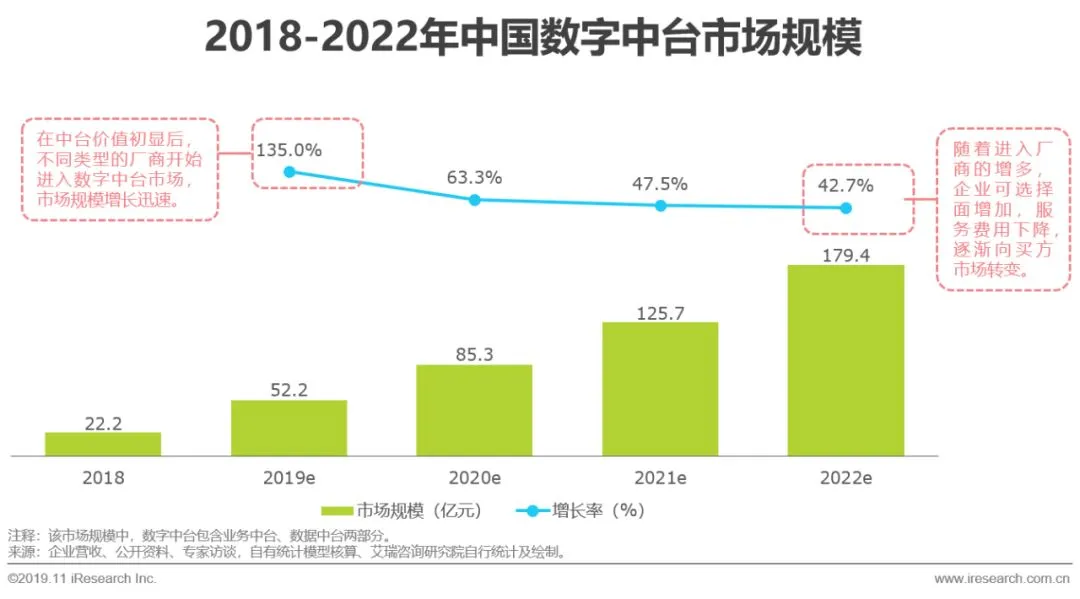 中国数字中台市场正处于高速发展时期,增长势头明显,主要因为2016年后国内独立软件服务商开始布局数字中台业务,以及创新型企业的进入,市场需求增加后,行业规模快速扩张。2018年,中国数字中台规模为22.2亿元,预计在2019-2022年间保持72.1%的复合年均增长率,2022年有望达到179.4亿元,未来整个数字中台市场将成长为千亿级别。与此同时,随着数字中台的理念逐步深入企业,相比传统ERP、CRM、HRM等系统,数字中台的前后台整合与技术业务的高效联动,或将改变企业的管理体系,也将改变企业未来软件服务的选择。目前,数字中台的渗透率较低,增量空间巨大,在企业数字化转型驱动下,需求增加,因此数字中台市场规模将迎来爆发期。