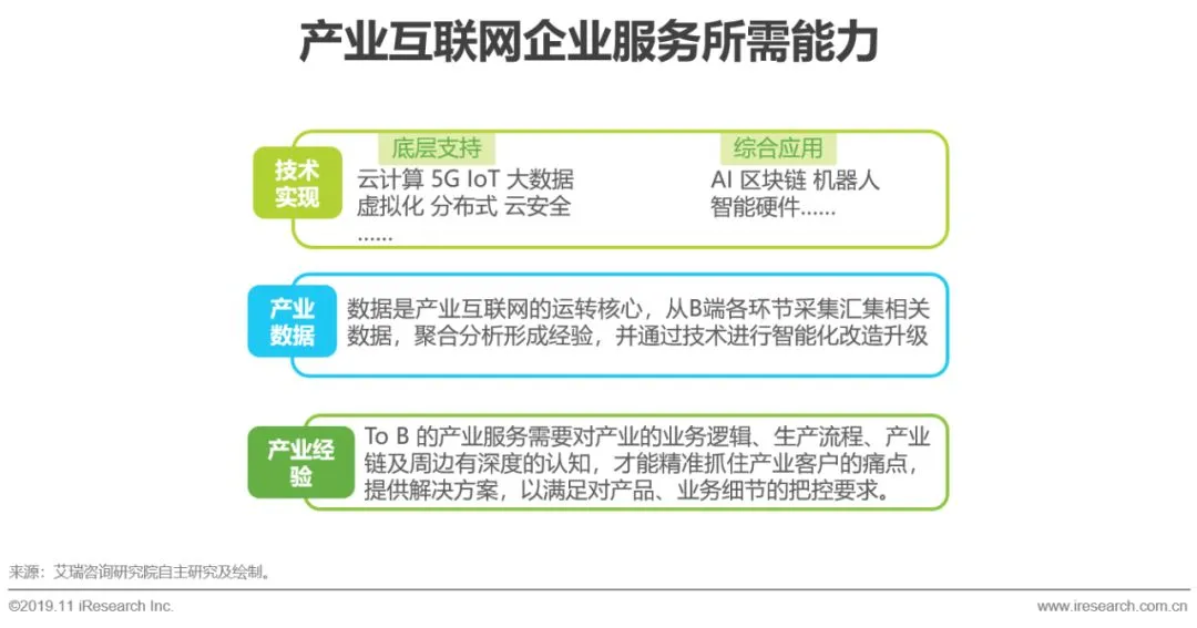 产业互联网要求企业通过数据化运营指导生产和业务。因此传统企业走向云化,核心业务实现在线化。与互联网的融合连接在广度和深度上不断拓展,围绕业务和用户的新模式在生产、技术、供应链等方面全面创新,重组生产要素及运营模式。业务在线化让企业对系统的敏捷化成为刚需。而传统企业内部IT能力弱,多数转为向外部求助。面对中国4000万中小企业的巨大蓝海,阿里、腾讯、百度、京东、美团等互联网大厂开始发力To B业务。实施“中台战略”推动内部协同,减少重复开发,向B端客户开放能力,推动企业数字化转型的同时,扩大自身行业版图。产业互联网本质是“用数据贯穿整个产业链,提高生产效能”,企业的中台能力决定了在产业互联网时代的竞争力。