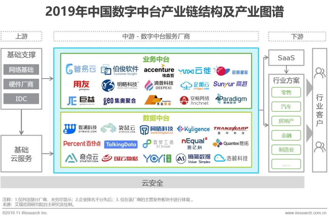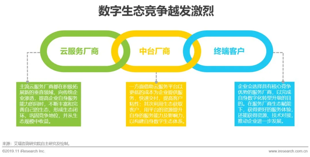 随着云计算、大数据、物联网、人工智能技术的指数级发展和壁垒的形成,企业欲通过自身培养这些领域的能力变得不切实际,但整个行业的价值链生态因技术和需求侧的变化,变得更加多元。未来企业不再是单独的价值个体,而是处于多个行业生态中的价值节点。数字中台应用从行业巨头向下渗透的过程,也是在企业云化背景下的生态争夺。云服务商、不同领域的软件服务商等都需要链接更多的资源和能力,通过合作打破产业边界,彼此赋能,构建全新价值链,共同抢占杆型市场,形成新的数字生态,寻求新的商业模式,以创造更丰富的市场。艾瑞认为,云时代围绕联接前后端的“数字中台”进行生态角力的激烈程度,会越发激烈。