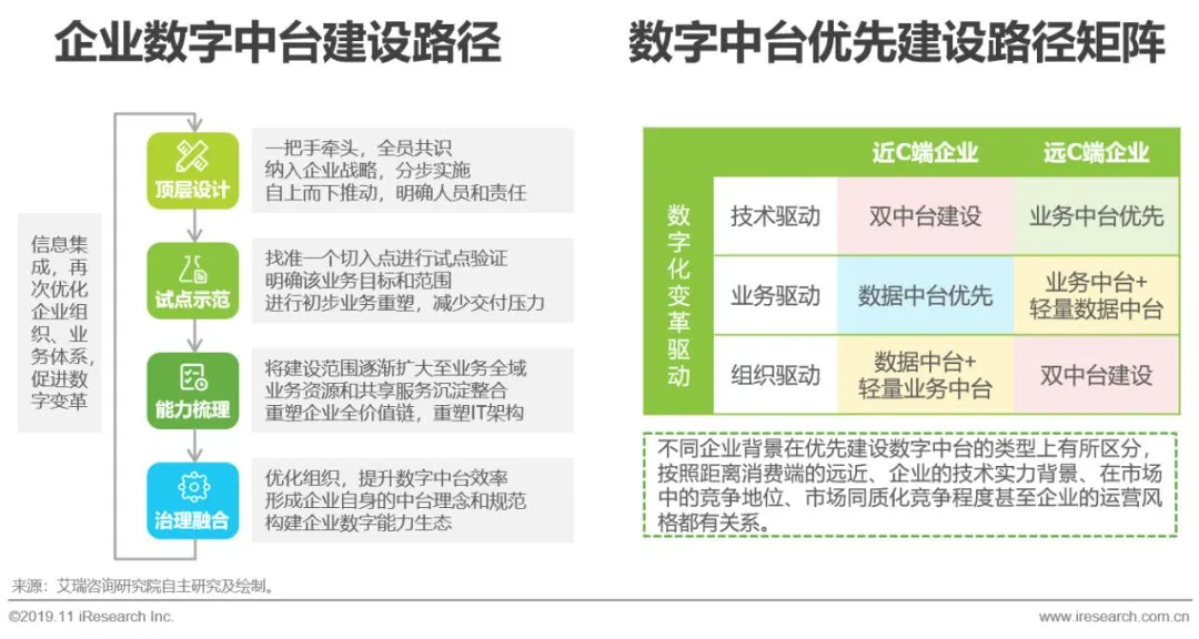 需根据企业数字化变革驱动力及产业链所处位置综合考量数字中台建设的路径及难度跟企业数字化变革驱动动力、行业背景直接相关,针对不同行业数字化渗透现状形成差异化的建设路径。靠近消费端的企业(如快消品、汽车制造、金融、医疗、教育等)积累了大量数据,对数据中台的需求更迫切,利用数据中台把业务处理需求和用户需求进行有效连接,让数据产生业务价值。在行业中处于垄断地位的企业,建立业务中台或是优选路径,以提升企业的运营和创新。拥有较强技术实力的企业会先通过调整IT架构,搭建技术中台来驱动自身业务中台和数据中台的建设,如互联网巨头从组织、技术等推动中台的落地。数字中台的建设路径没有一个通用的企业级模型套用,要从企业所处产业链全局角度进行考虑,需要自上而下贯彻。