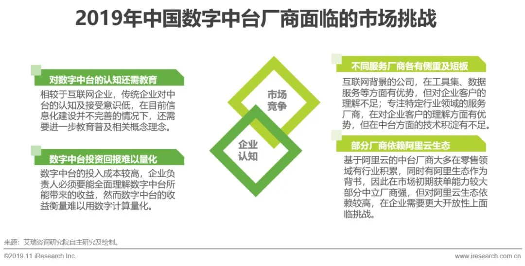 数字中台现在正处于早期阶段,真正建设数字中台或用来进行系统升级的企业比例很小。各领域行业内,面向消费者端的行业还没有特别成熟的方法和工具,不同厂商都在进一步探索和实践,数字中台的商业价值未完全展现,规模应用还需要等待市场的孕育,落地实施中仍有诸多挑战。