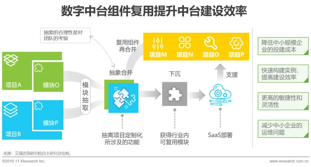 依托特定行业服务经验,围绕业务中台形成更多SaaS应用随着行业头部及领先企业的数字中台项目落地实施,行业中腰部企业对于数字中台的认知也在不断增强,相比于头部企业,中腰部企业的数字中台能力需求相对简单,但对于成本也更加敏感。因此,基于公有云或混合云提供通用、轻量化的数据中台能力,并整合数据应用服务,为客户提供敏捷部署、便捷易用的整体解决方案将成为数字中台服务商占领市场的模式之一。虽然行业之间、企业和企业之间在所需服务上有差异,但依然存在可跨行业、跨企业复用的组件、模块,通过不断沉淀客户和标准化产品服务,进行SaaS化,将降低数字中台的构建成本。