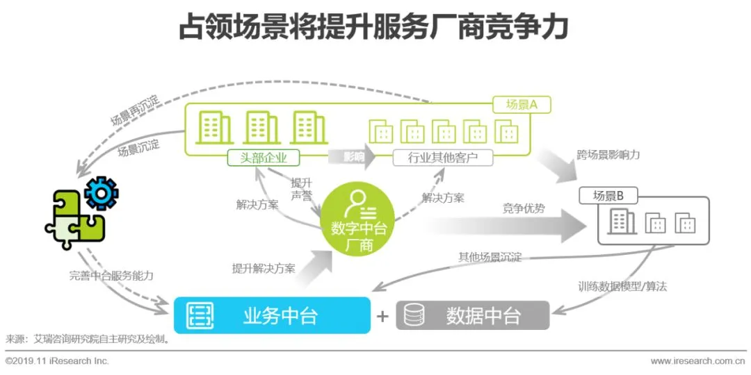 数字中台服务厂商通过争夺行业头部企业客户,在服务过程中掌握行业场景需求,并通过头部客户辐射至行业领先企业,最终完成对场景的沉淀,构建出符合行业需求的业务中台,因此服务厂商都在积极争取各行业头部企业,占领场景优势,以提升整体市场竞争力。