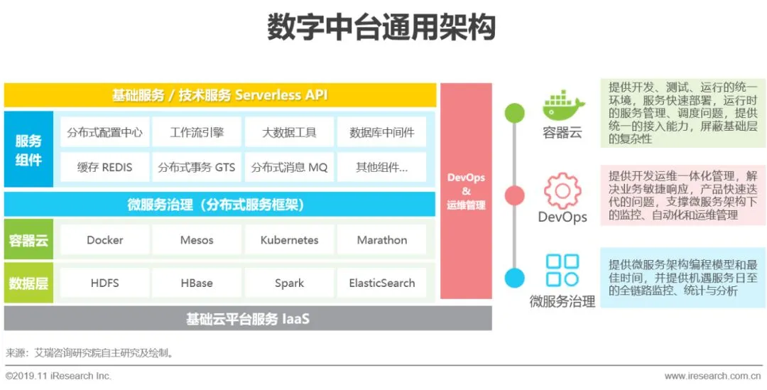 容器云、DevOps、微服务成最佳载体,是首选架构数字中台为业务而生,快速敏捷地响应业务变化,以服务的形式为业务提供支撑,服务接入层以统一的路由适配转发。在整个技术构架上就需要考虑可拓展性、敏捷性、轻量化,并注重与前台的交互,灵活地通过服务编排实现应用功能,满足前台需求。因此数字中台融合分布式、微服务、容器云、DevOps、大数据处理及高可用高性能高并发架构,遵循“高内聚、松耦合”设计原则。业务中台需要微服务、云原生、分布式事务体系支撑,并设计业务模型和微服务边界,最终形成业务单元;数据中台引入多终端、多形态数据,采用数据分层架构模式,同时需要指标管理、数据服务、元数据管理等一系列的数据管理技术做支撑。中台不是微服务,但微服务是当前数字中台建设的最佳实践。
