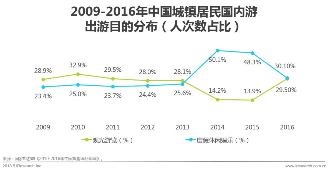 根据国家旅游局公开数据显示,2009-2016年间中国城镇居民国内游出游目的出现了巨大的改变。从2011年开始,以度假休闲娱乐作为出游目的的城镇居民数量占总体的比重逐渐上升,在2014年出现大幅增长,出游人数占总体的50.1%,2016年小幅下滑至48.3%。从2010年开始,以观光游览作为出游目的的城镇居民数量占总体的比重呈现下降趋势,在2014年大幅下滑至14.2%,但在2016年陡然回升。艾瑞分析:随着出境游越来越火热,存在语言沟通等天然问题的出游游客对跟团游的接受度较高,因此以观光游览为主要出游目的的游客人次数占比再次升高。