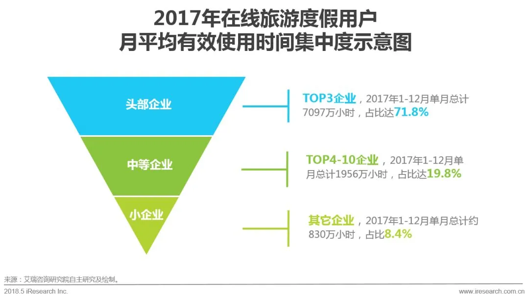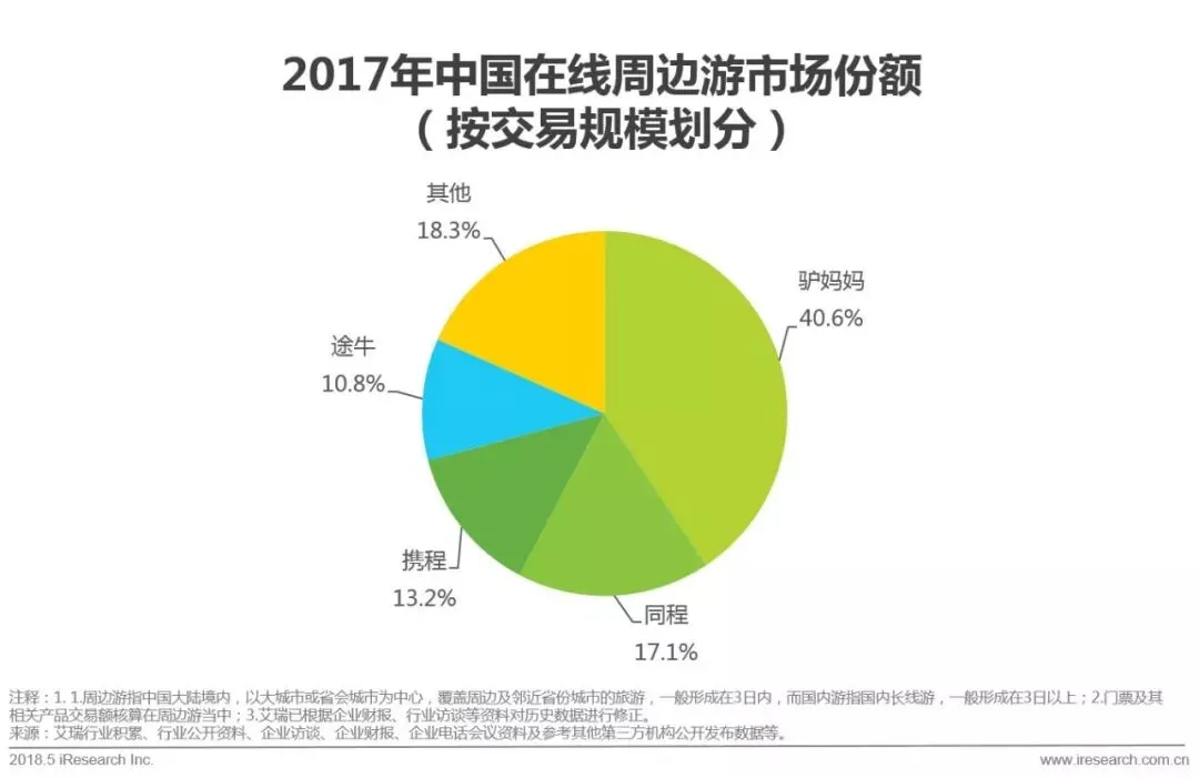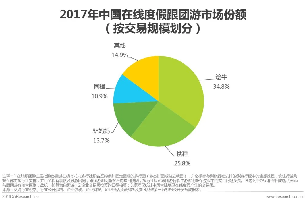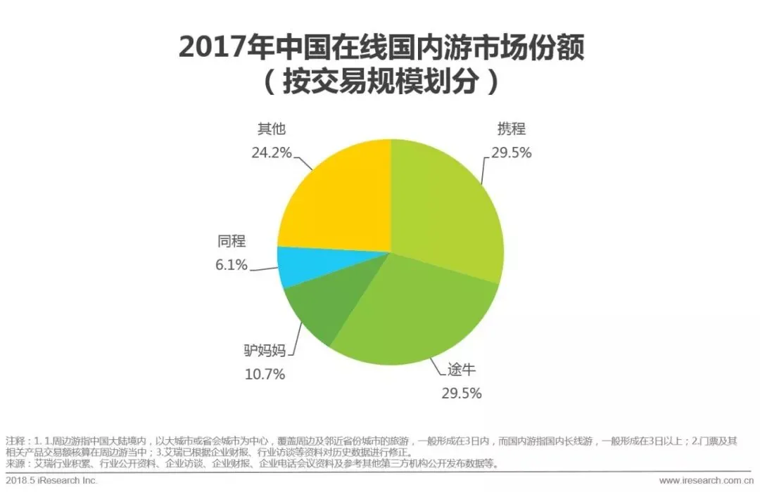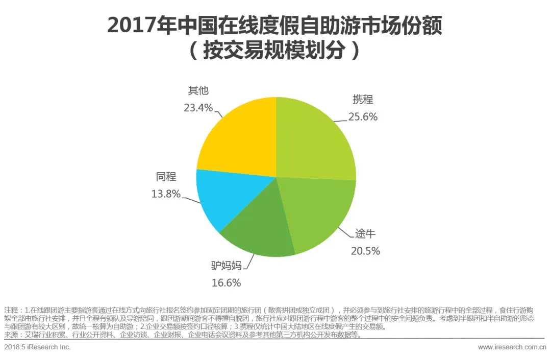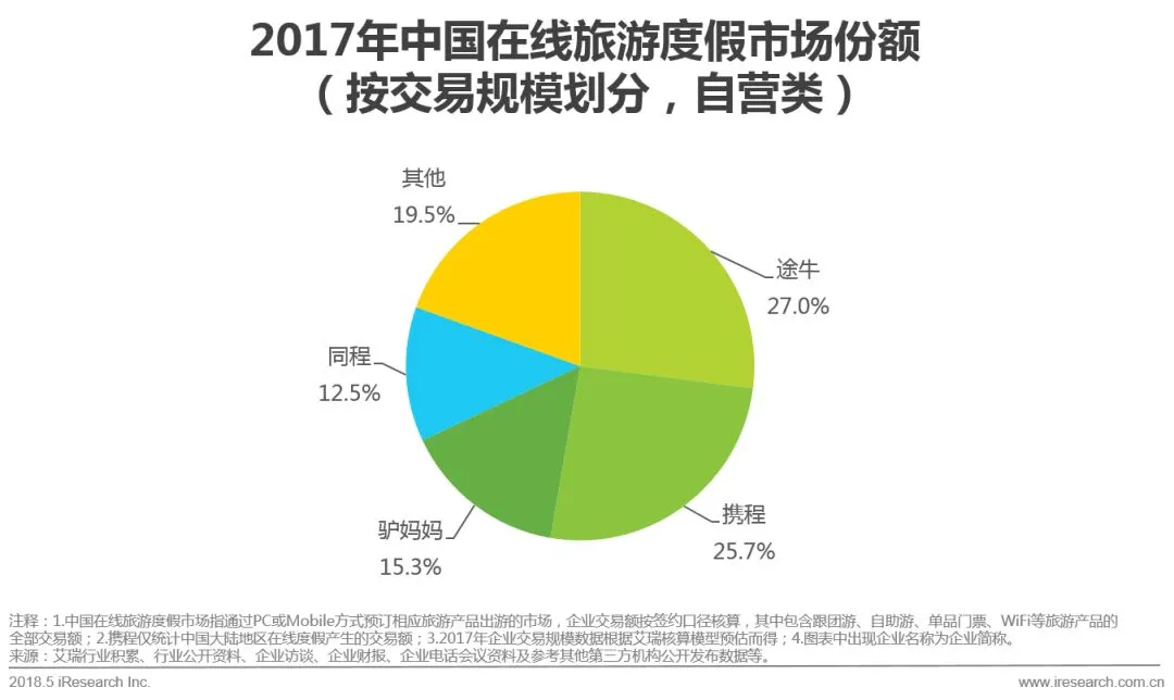 3.2017年中国在线度假市场交易规模达978.9亿元,较2016年增长31.8%。头部企业的市场份额保持稳定,途牛、携程、驴妈妈分列前三。
