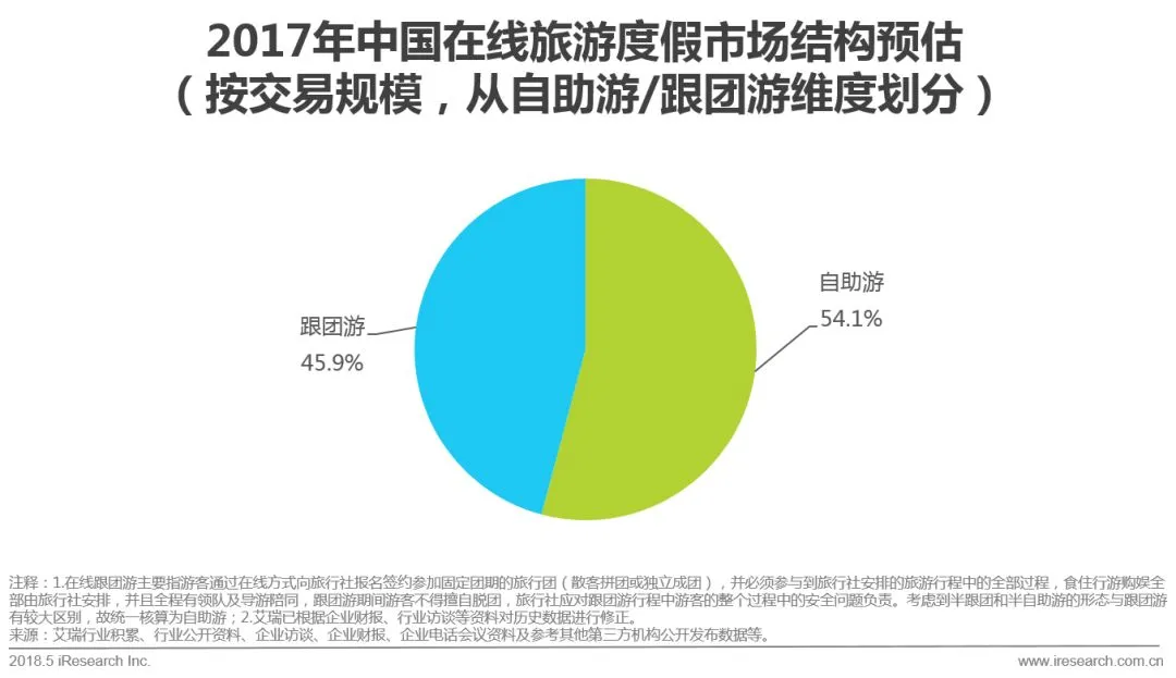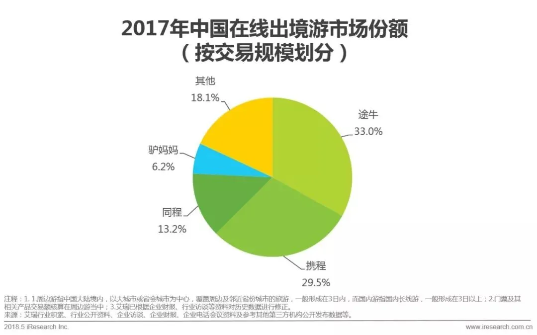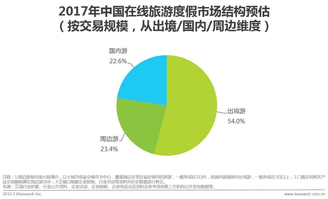 4.出境游市场占比持续提升,在2017年达54.0%;与此同时,周边游占比首次超过国内游,主要原因在于假期的碎片化使得越来越多的用户选择短期周边游玩。