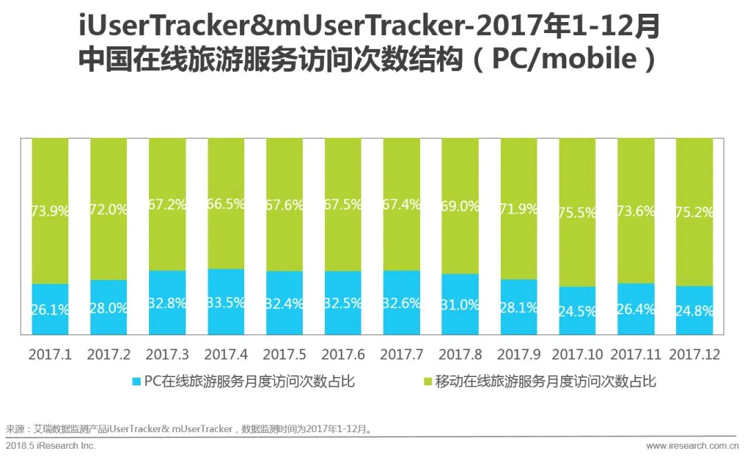 艾瑞监测数据显示,2017年中国在线旅游行业移动端用户访问次数占总体近七成。其中1-2月及9-12月的移动端月度访问次数占比均超过了70%,而10月及12月均超过了75%。艾瑞分析认为,随着中国移动互联网的进一步发展,用户对于移动端的接受度及使用频次会随之大幅增高,未来移动端访问次数占比还将进一步提高。