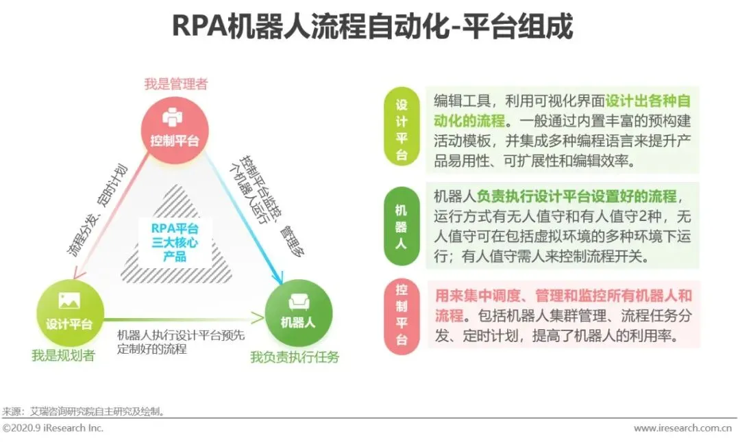 RPA平台主要由设计平台、机器人、控制平台组成