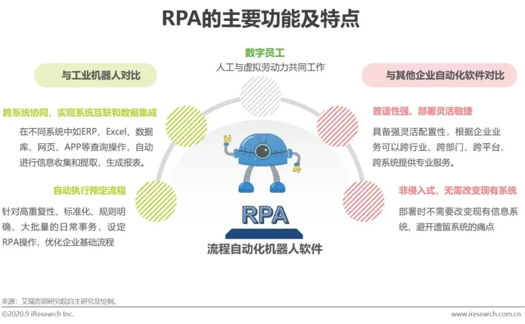 工业机器人由来已久,RPA相对于传统代替人类手工劳动的机器人,主要用于在信息系统的自动化操作,具备自动执行预定流程和跨系统协同的能力。而与ERP、OA等特定应用场景软件比较,RPA普适性更强,可以跨部门、跨行业进行部署。且RPA是非侵入式软件,无需改变现有系统即可完成部署,因此产品灵活性强,交付周期短,同时可以避开传统企业遗留系统问题,帮助企业快速迭代转型,实现业务流程自动化。